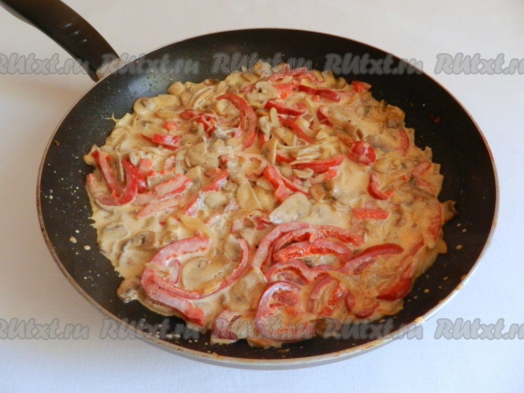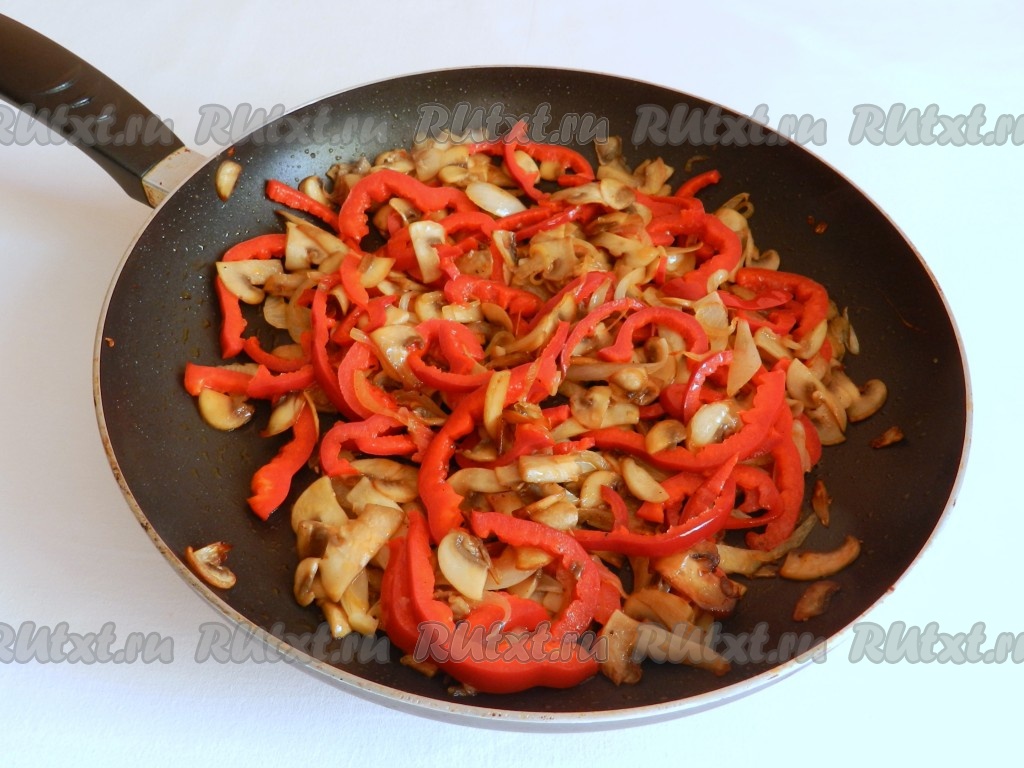 На растительном масле обжарить шампиньоны до испарения жидкости, добавить лук, перец, зубчик чеснока, пропущенный через пресс. Посолить, поперчить. Немного обжарить все вместе.