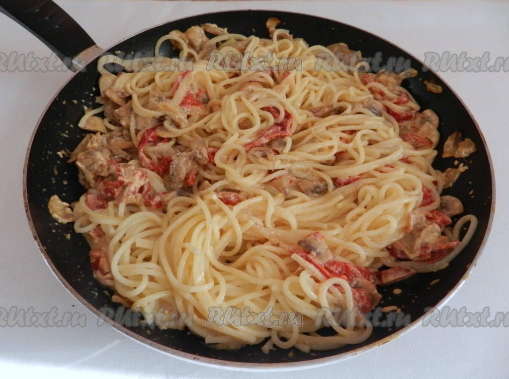 Готовые спагетти откинуть на дуршлаг, слить жидкость и добавить спагетти в сковороду с соусом из шампиньонов. Перемешать. Прогреть все вместе на медленном огне 2-3 минуты.