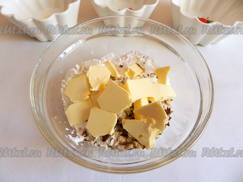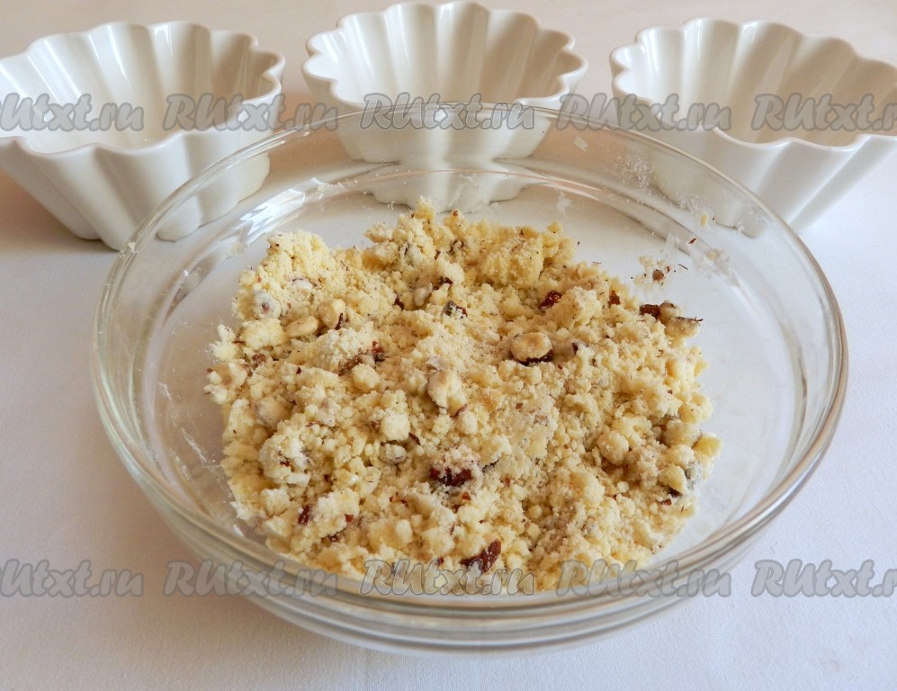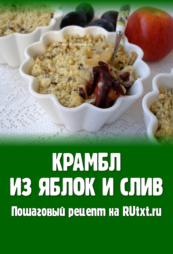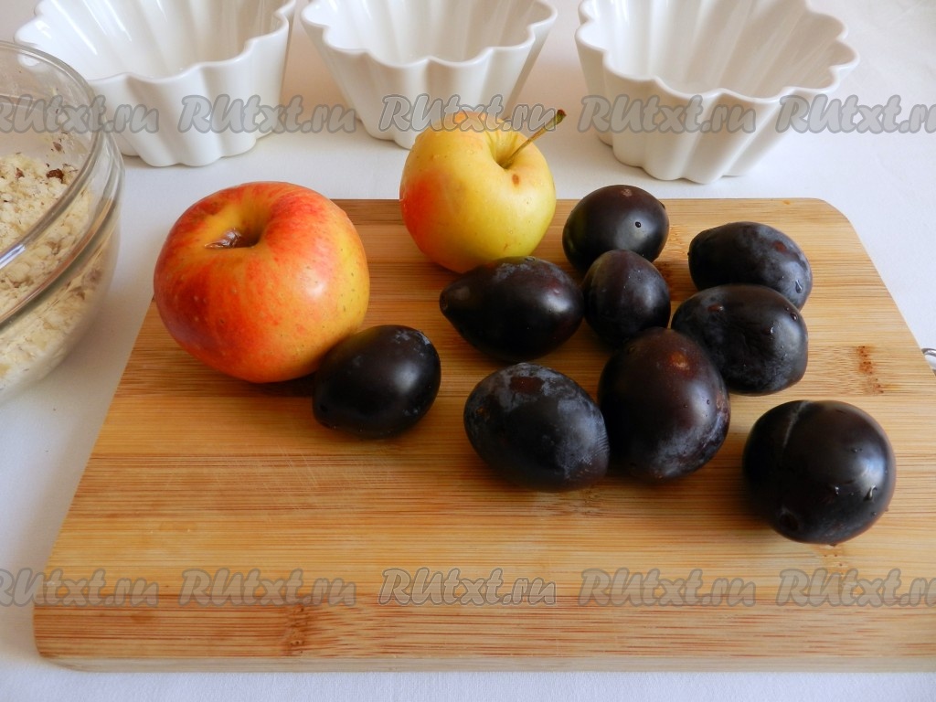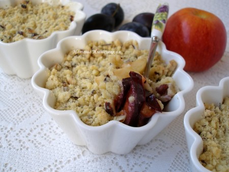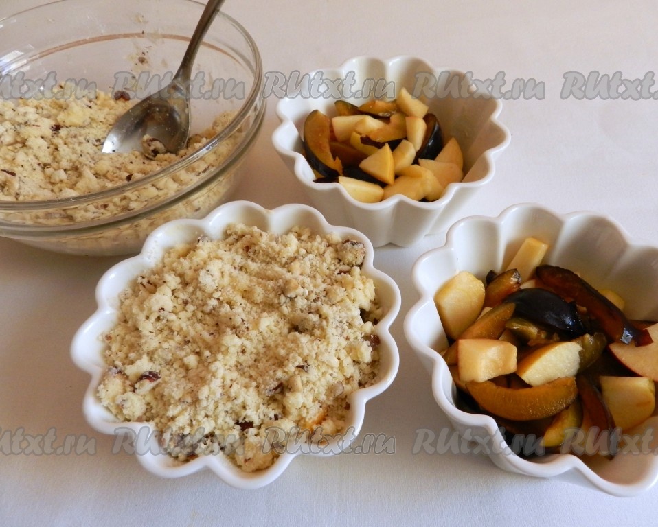 Незатейливый десерт крамбл родом из английской кухни. Сочные фрукты или ягоды запекаются под хрустящей корочкой, получается очень вкусно. Готовят крамбли в порционных формочках, в них же и подают в теплом виде.  Дополнением может быть шарик мороженого. Я предлагаю приготовить кламбл из яблок и слив, а в тесто добавить измельченный фундук.