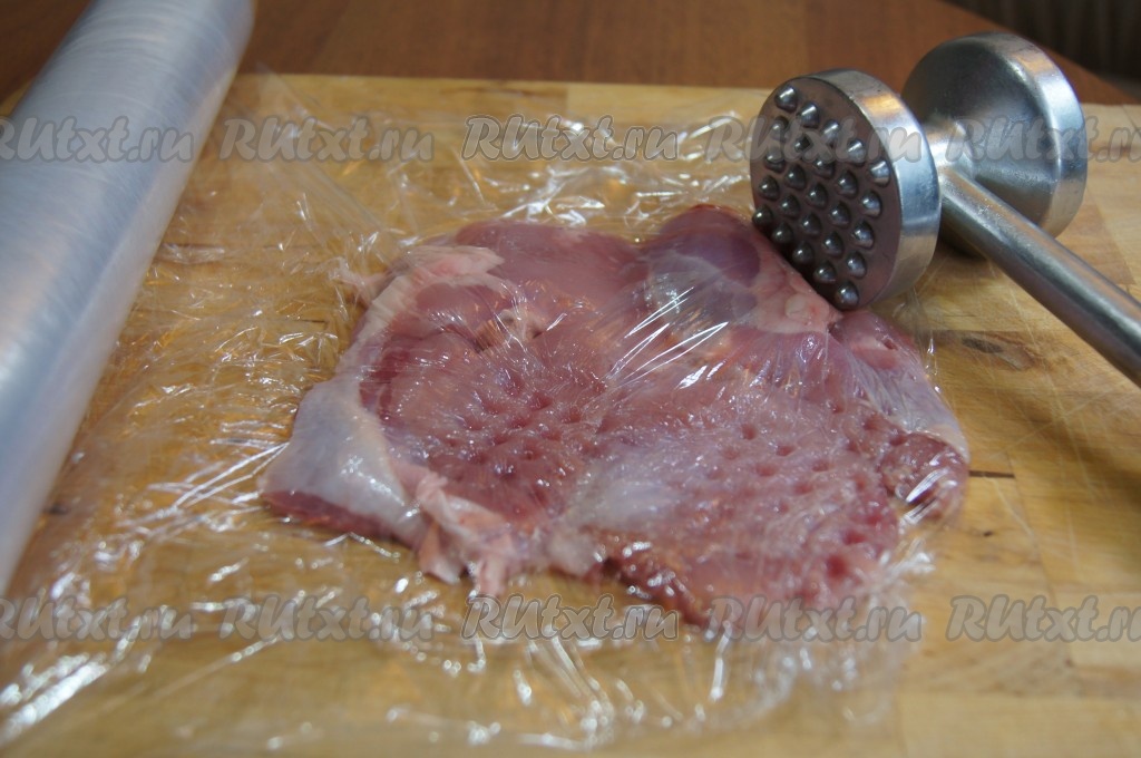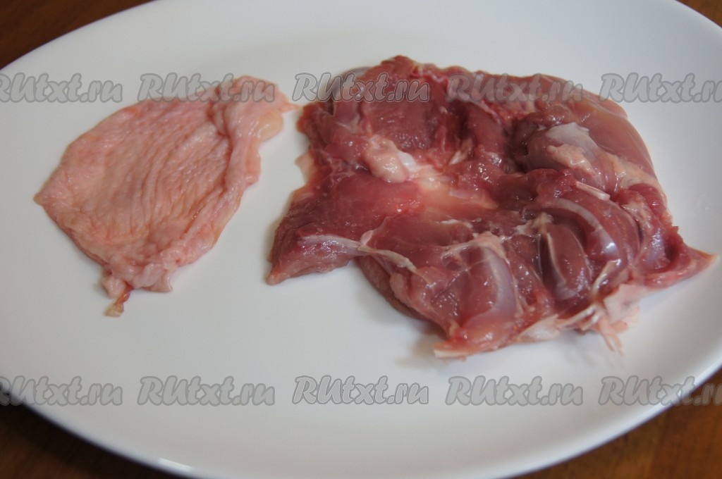 На пищевую пленку положите бедрышко, сверху тоже разместите пищевую пленку и отбейте (отбивайте очень тонко, иначе завернуть начинку не получится).