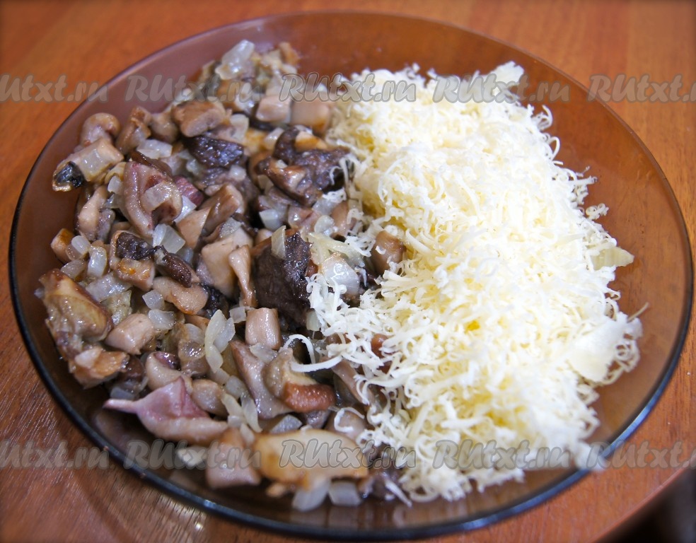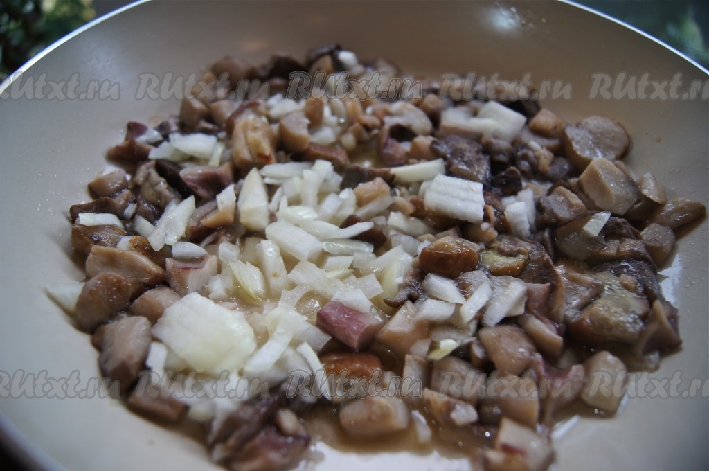 Отбитые бедрышки посолите, поперчите и оставьте пока будете готовить начинку. Грибы обжарьте с рубленным луком на сливочном масле до готовности (лук должен быть прозрачным или золотистым).