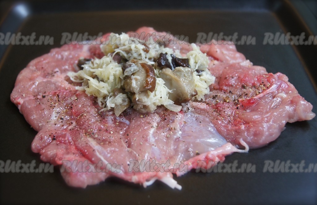 На отбитые бедрышки положите начинку из грибов, лука, сыра.
