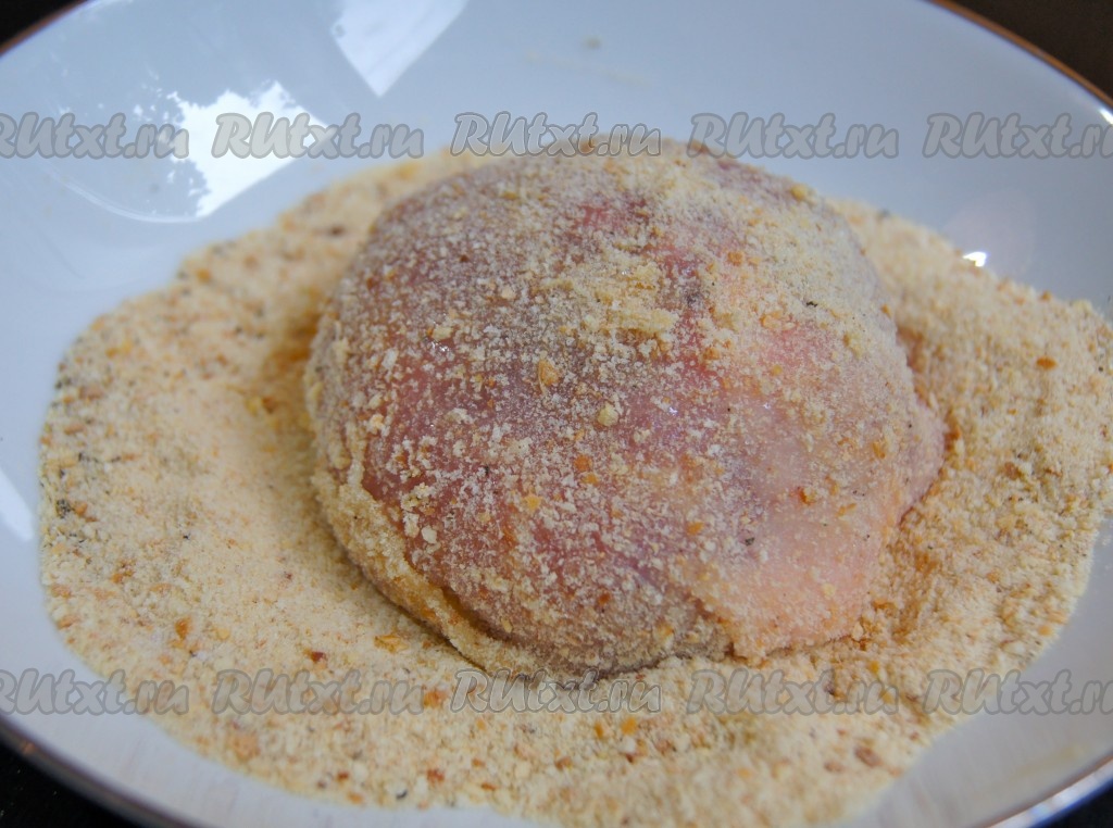 Заверните зразу (если отбили не достаточно тонко, то закрепите шпажкой, потом ее извлечете). Окуните каждую куриную зразу во взбитое яйцо, затем в панировочные сухари.
