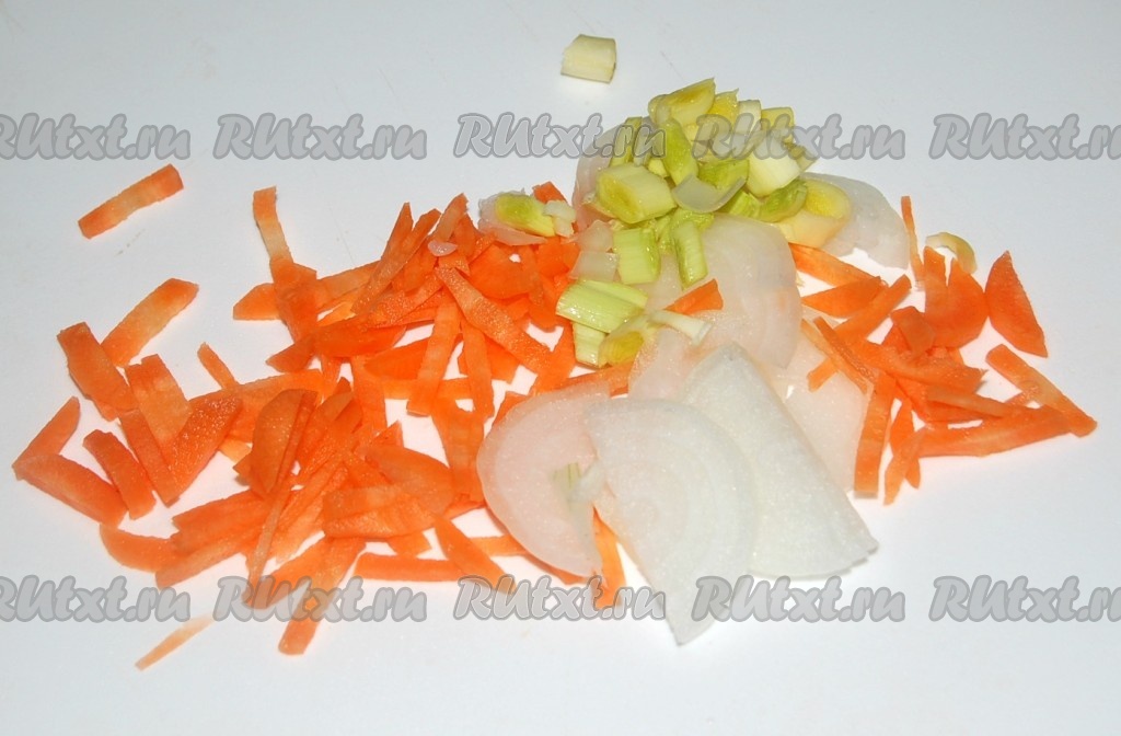 Морковь, лук порей (необязательно) и репчатый лук нарезать небольшими кусочками для супа (см. фото).