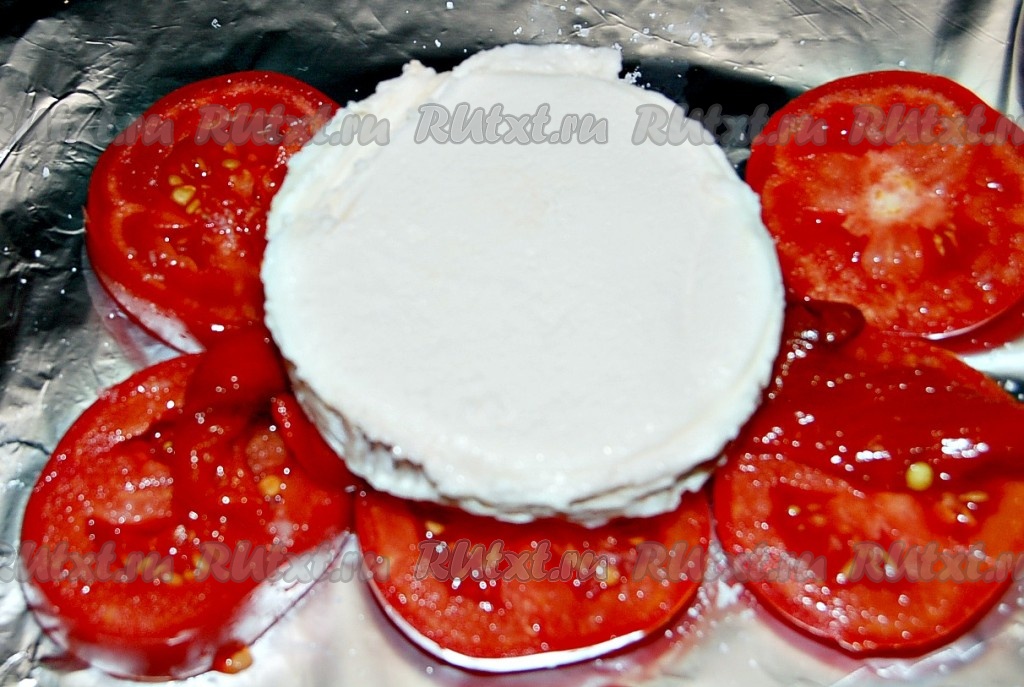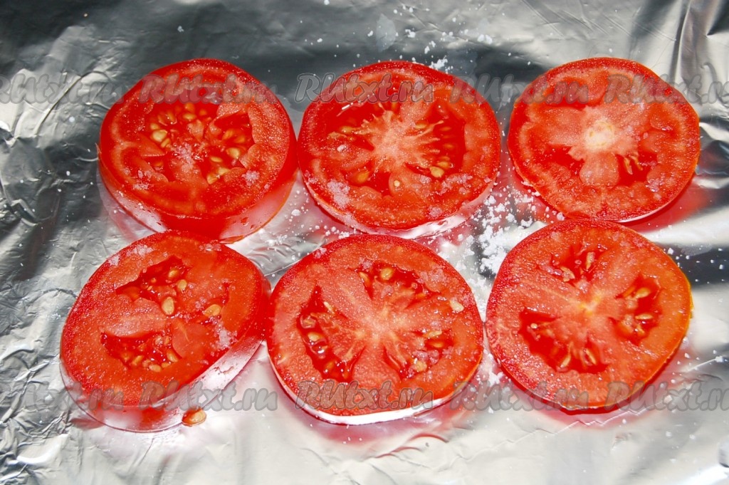 Нарезать свежие помидоры кружками и выложить в один ряд на фольге, слегка посолить.