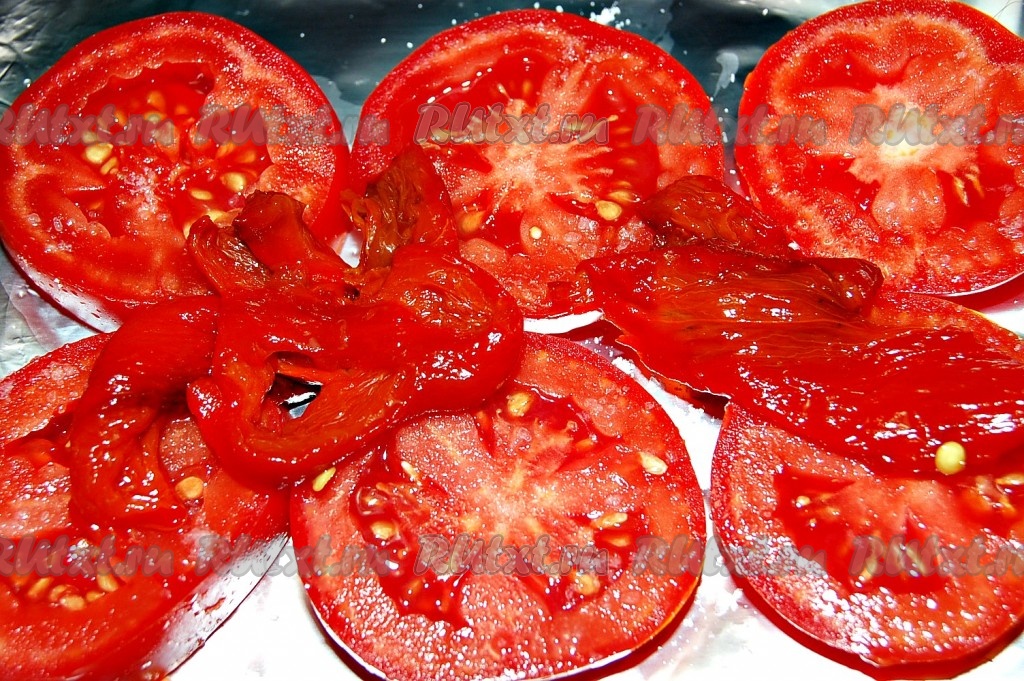 На помидоры выложить кусочки запеченного перца без кожицы.