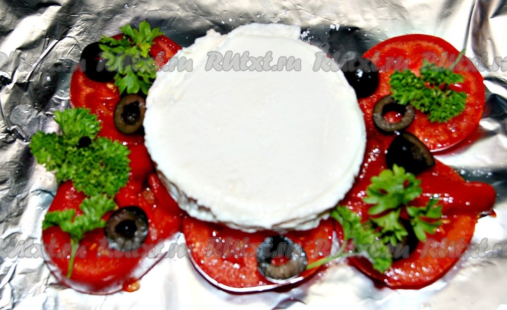 Затем вытащить сковороду из духовки, развернуть пакет из фольги с запеченным сыром.