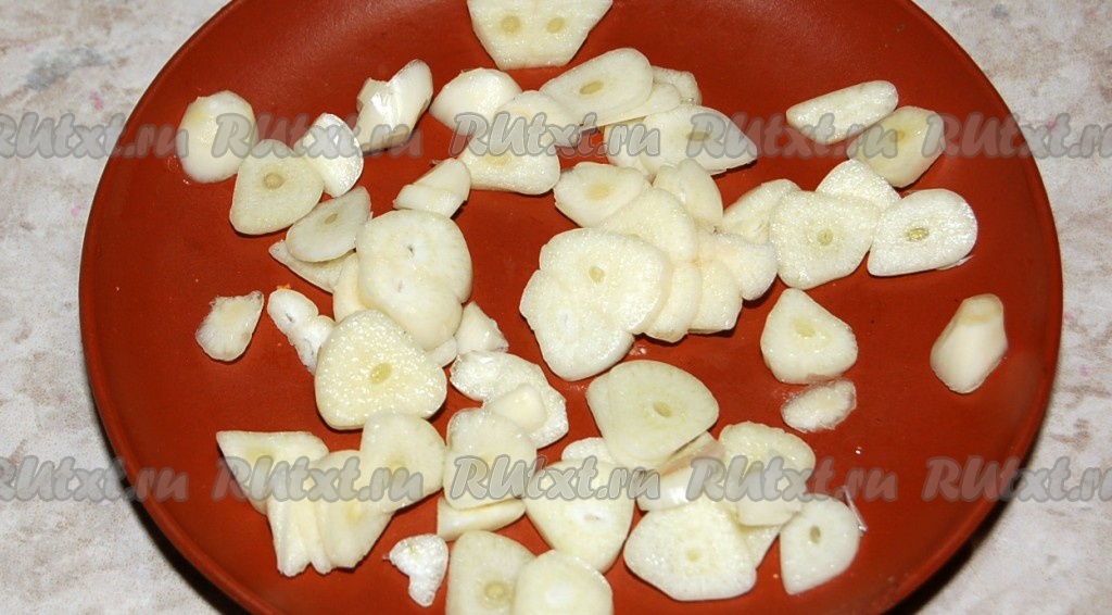 Чеснок нарезать тонкими пластинами.