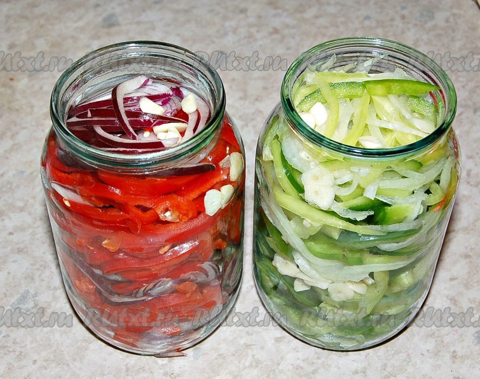 Плотно набить банки перцами с луком и чесноком.