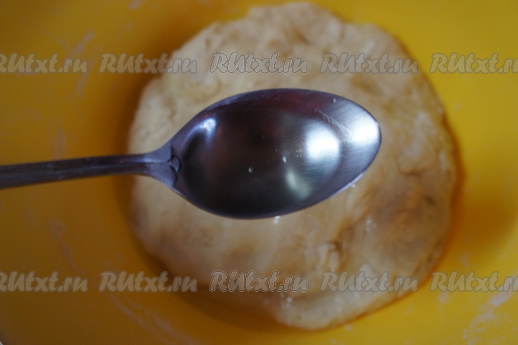 Тесто будет приятным, эластичным и чуть "глянцевым" от масла. Накрыть тесто полотенцем и поставить в тёплое место на 20-30 минут. Тесто должно подняться.