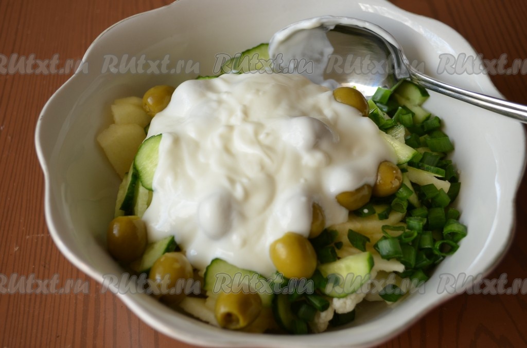 Заправить салат из свежей цветной капусты натуральным йогуртом, посолить по вкусу, перемешать.