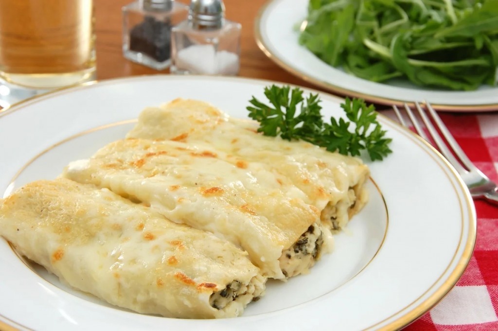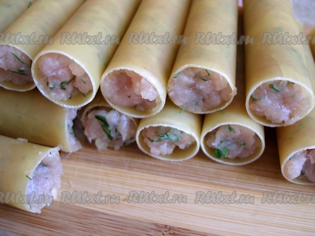 Каннеллони наполнить получившимся фаршем, стараясь не заполнять слишком плотно.