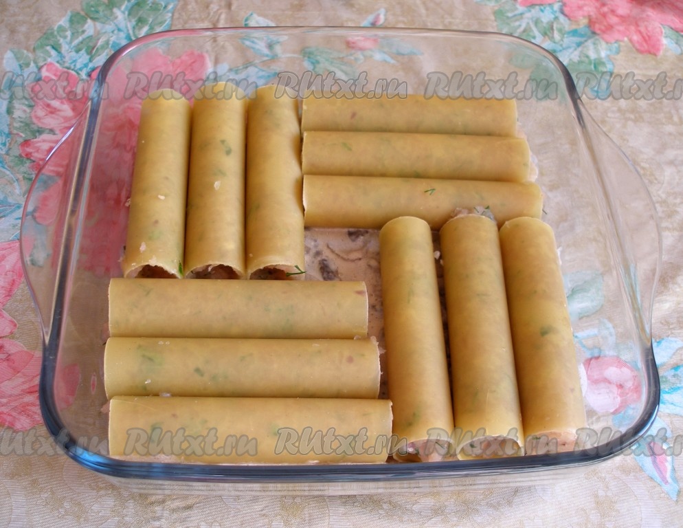 В отдельной ёмкости смешать сметану с водой, посолить, поперчить, тщательно перемешать получившийся сметанный соус. В форму для запекания, смазанную маслом, налить 1/3 сметанного соуса, затем выложить фаршированные каннеллони (лучше выкладывать их в один слой), оставшийся соус равномерно распределить поверх каннеллони.