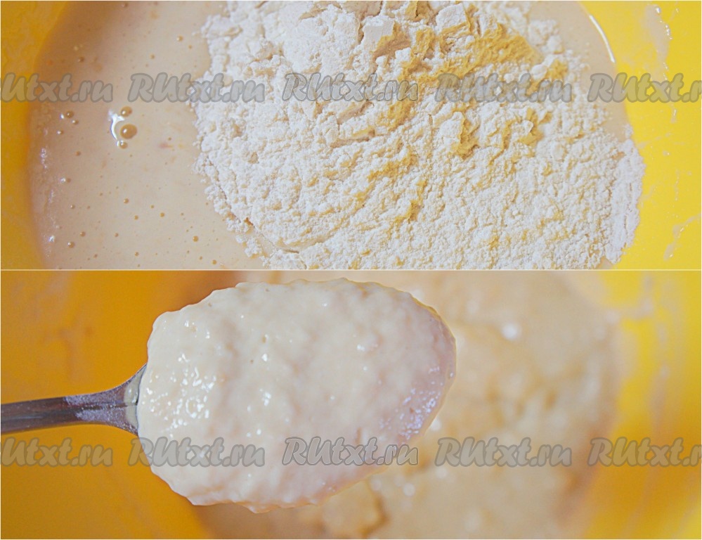 Добавить в тесто оставшуюся муку. Тщательно перемешать. Тесто должно получиться густое.