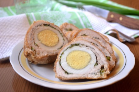 Перед подачей куриные рулетики с начинкой из варёного яйца нарезать кусочками. Как видите, рецепт прост, а получается и вкусно, и эффектно!