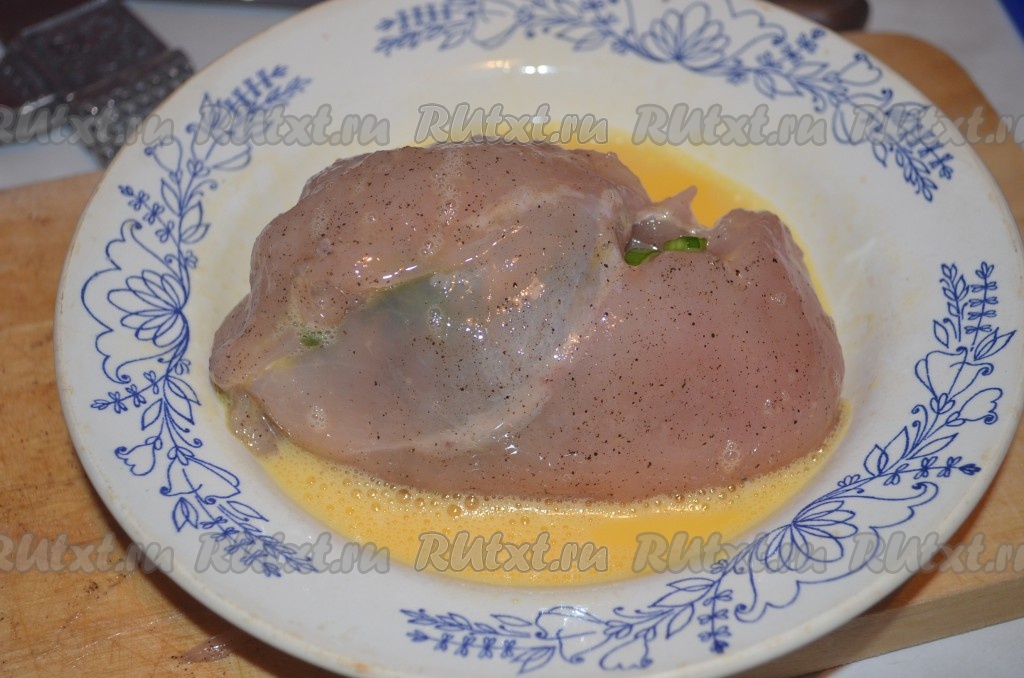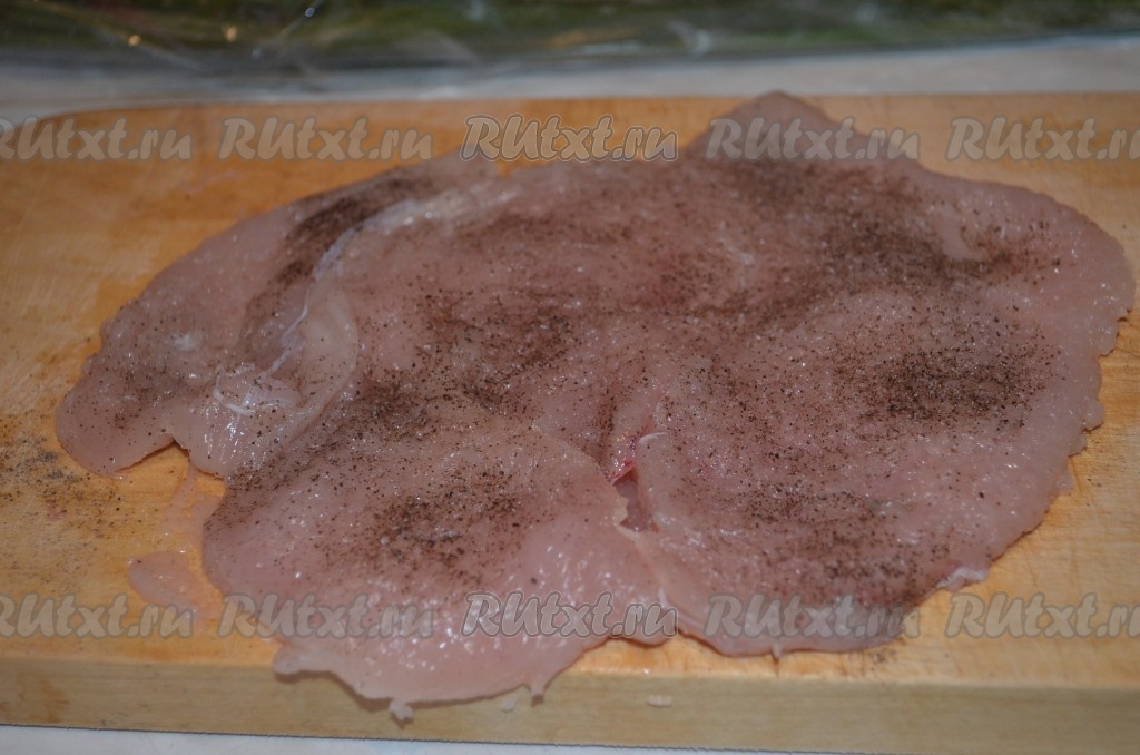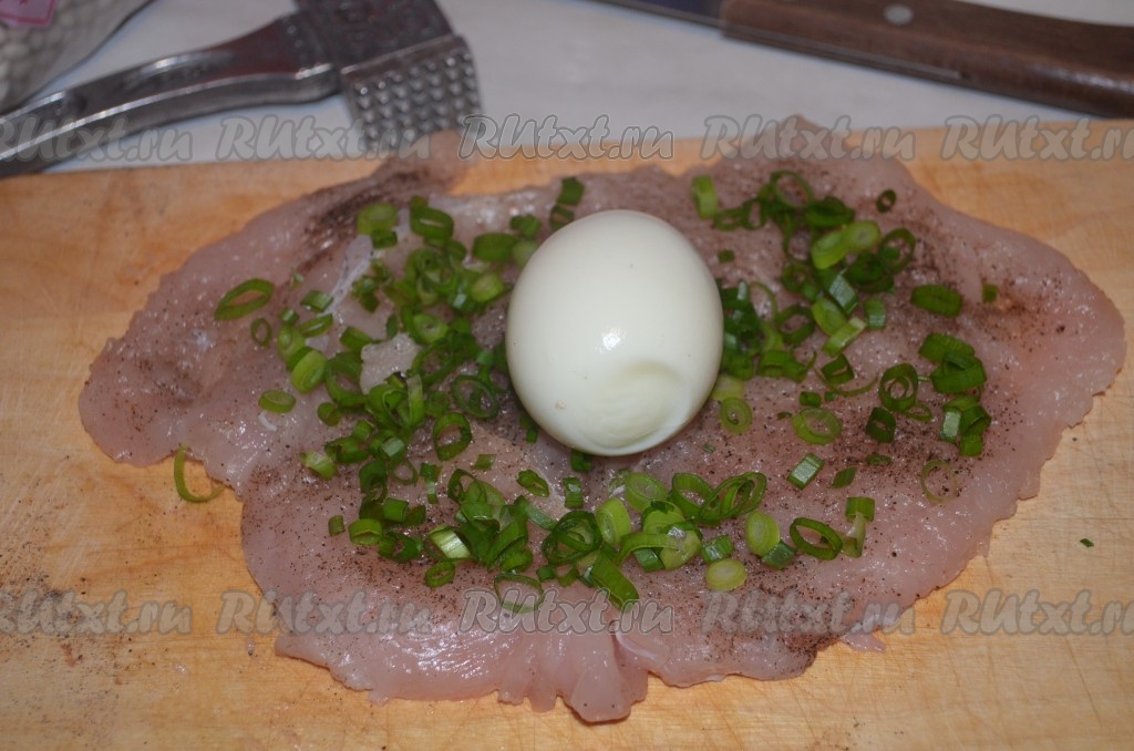 2 яйца предварительно отварить в воде в течение 8-10 минут с момента закипания, остудить и очистить. Каждое куриное филе аккуратно надрезать вдоль и развернуть, как книжку. Отбить, посолить и поперчить по вкусу.