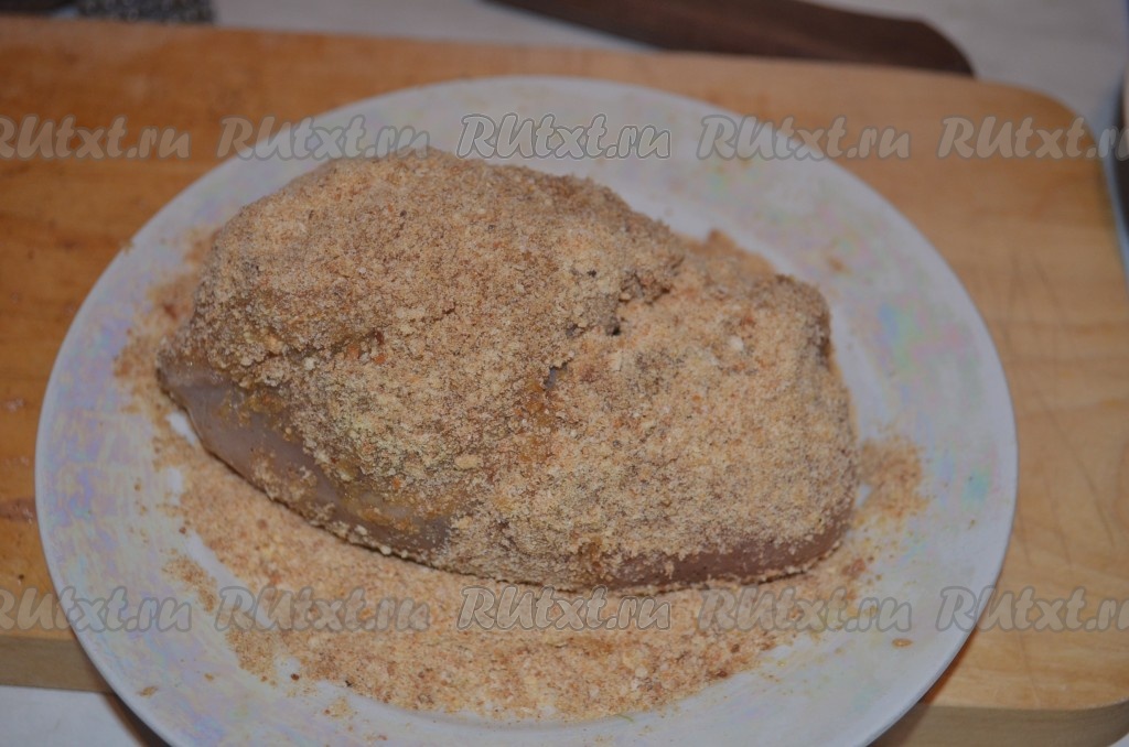 Затем этот куриный рулетик обвалять в панировочных сухарях. Аналогично сформировать куриный рулет с варёным яйцом из второго филе.