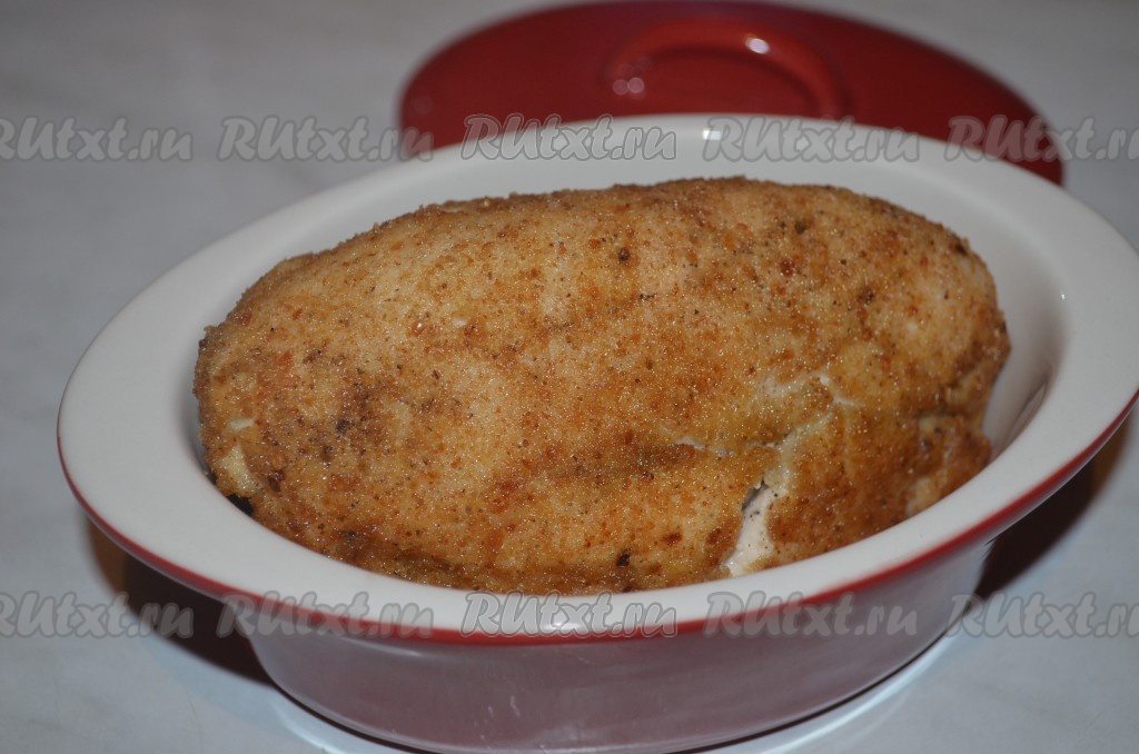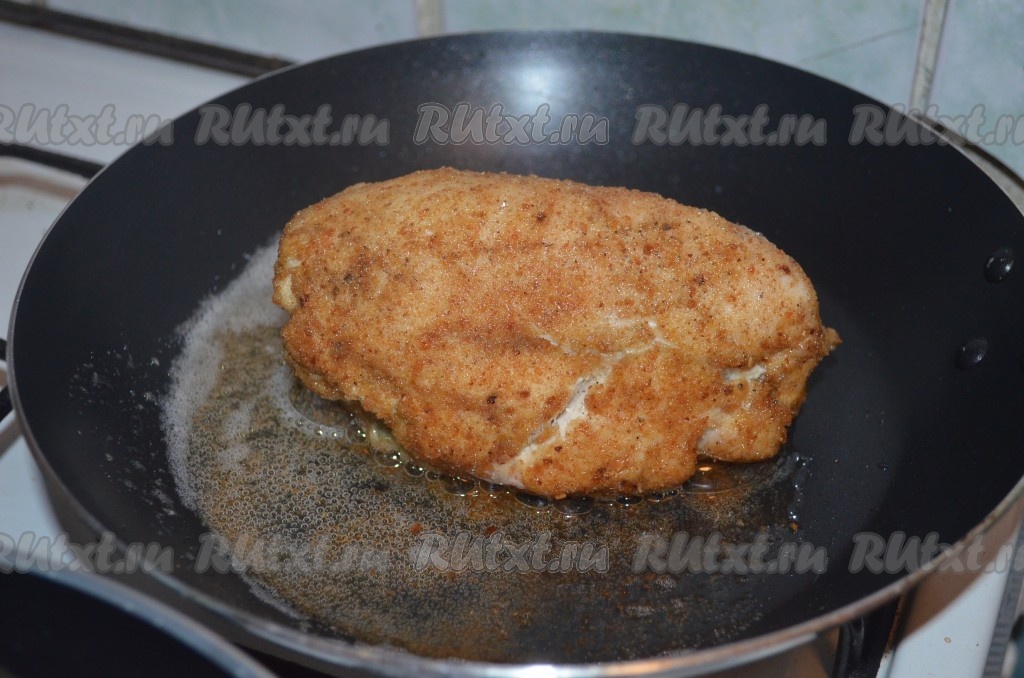 Свернуть куриное филе так, чтобы яйцо полностью оказалось внутри. Сырое яйцо разбить в тарелку, взбить его вилкой до однородности. Куриный рулет с варёным яйцом внутри аккуратно обмакнуть со всех сторон во взбитое яйцо.