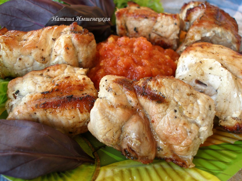 Шашлык из свинины, маринованный в уксусе и луке, готов. Он получился очень сочным, ароматным и вкусным. Я подала шашлык со свежей зеленью, овощами и домашним томатным соусом.