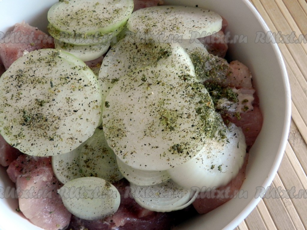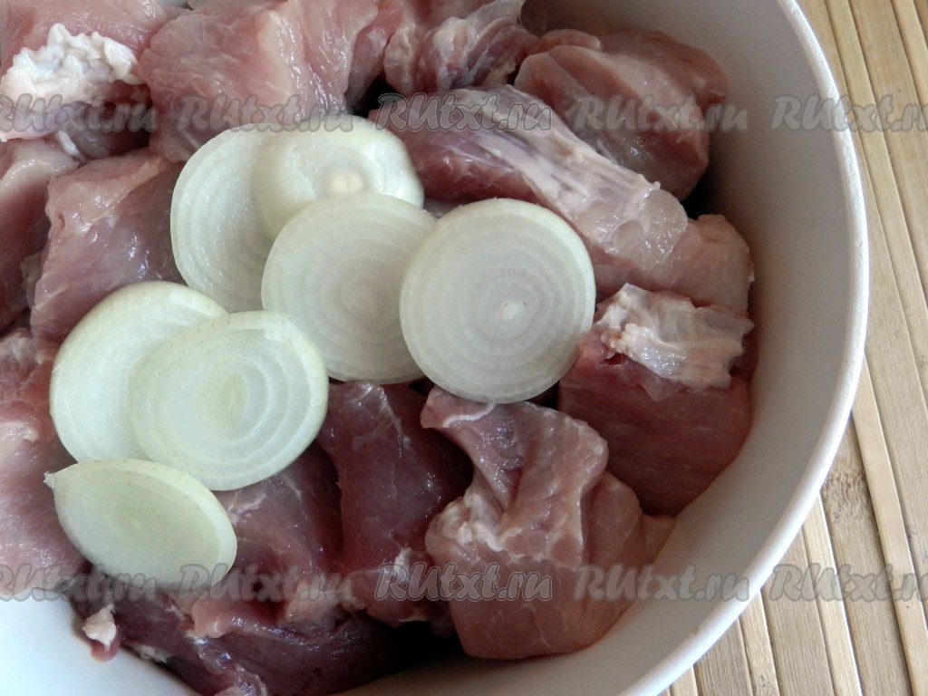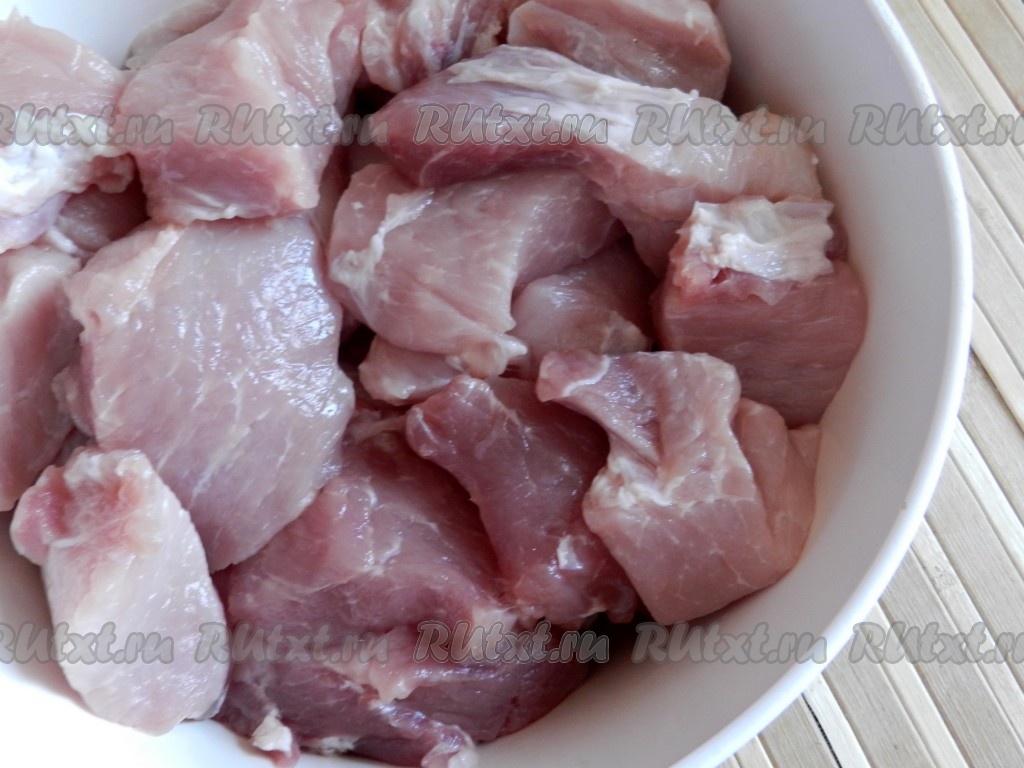 Свинину нарезать на достаточно крупные куски примерно одинакового размера (размер кусочков должен быть таким, чтобы мясо удобно было надевать на шампуры). Сложить нарезанное мясо в глубокую миску.