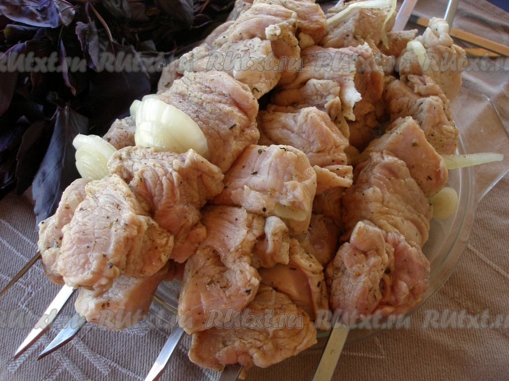 Мариновать шашлык из свинины в уксусе и луке 2-3 часа в прохладном месте. Затем нанизать кусочки мяса на шампуры, чередуя с луком.