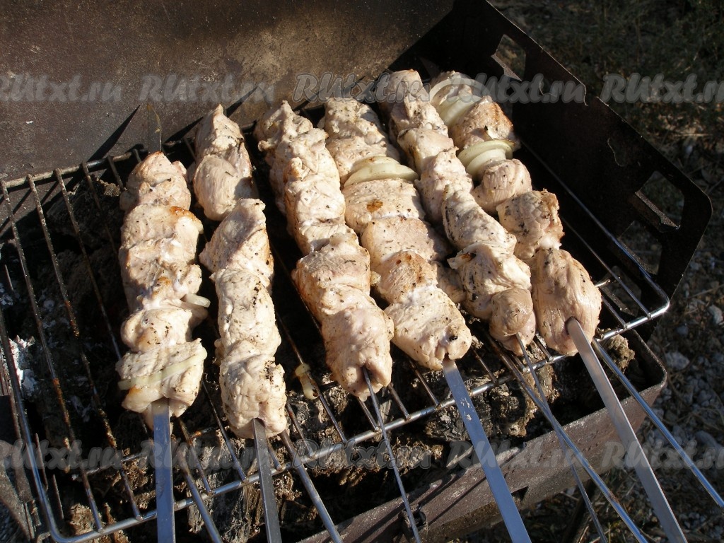 В мангале сжечь дрова до углей. Жарить шашлык на седых углях без прямого огня до готовности.
