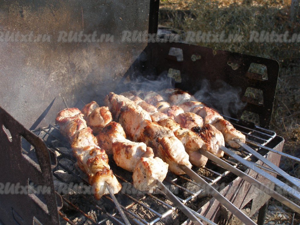 Жарим периодически переворачивая шампуры, чтобы мясо не пригорело (продолжительность жарки зависит от жара углей, обычно свинина готовится около 20 минут). Готовность проверить, надрезав кусочек мяса ножом, если из разреза выделяется прозрачный сок, в нём нет примесей крови, значит свинина готова.