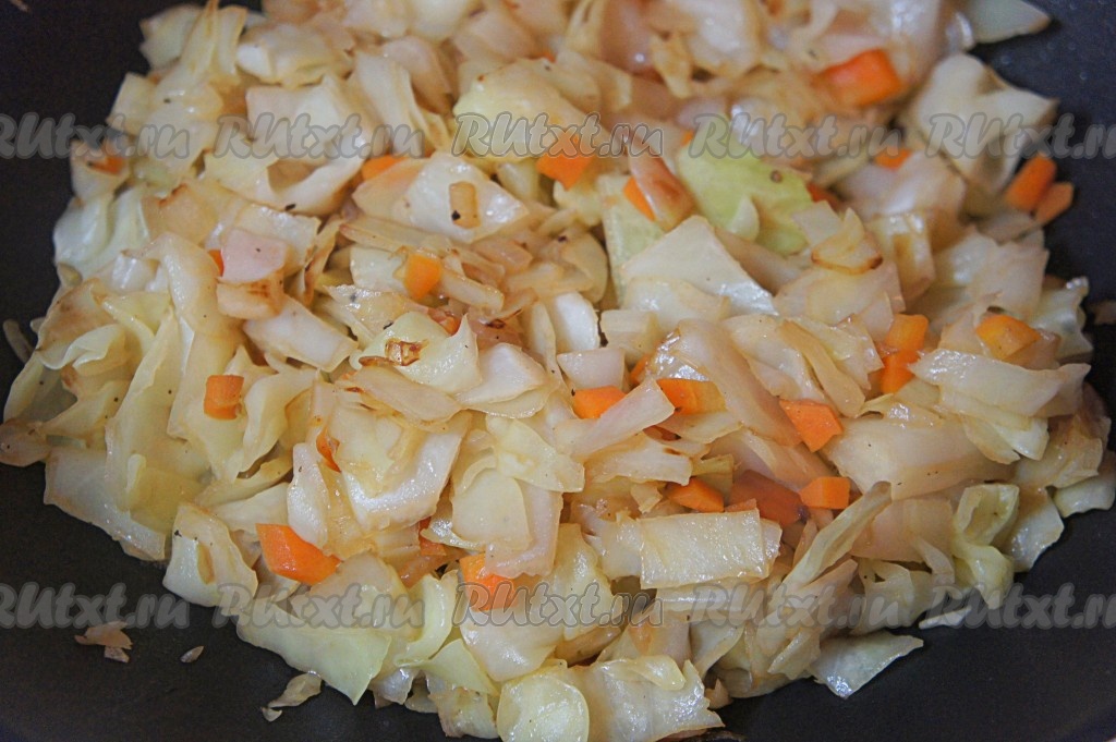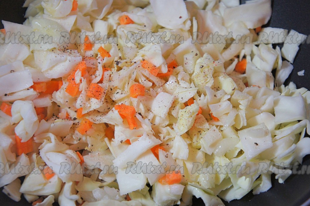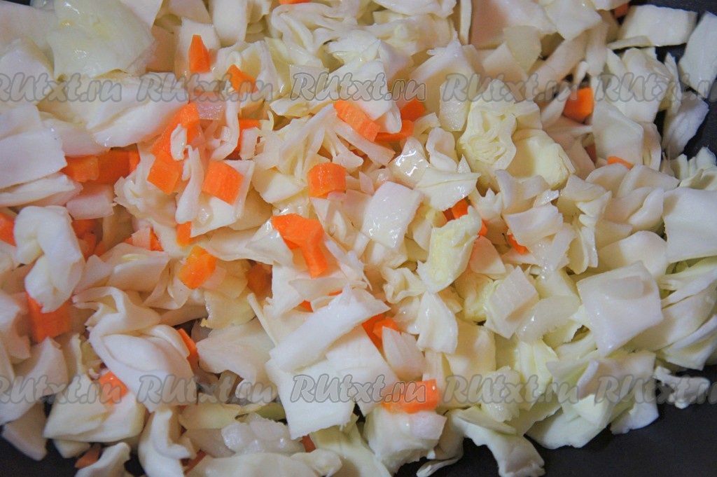 Капусту нарезать средним кубиком, добавить нарезанную мелким кубиком морковь и лук.
