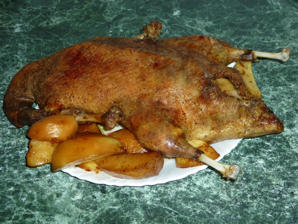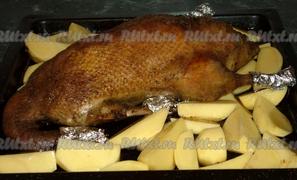 Утка, запечённая с яблоками и картошкой в духовке