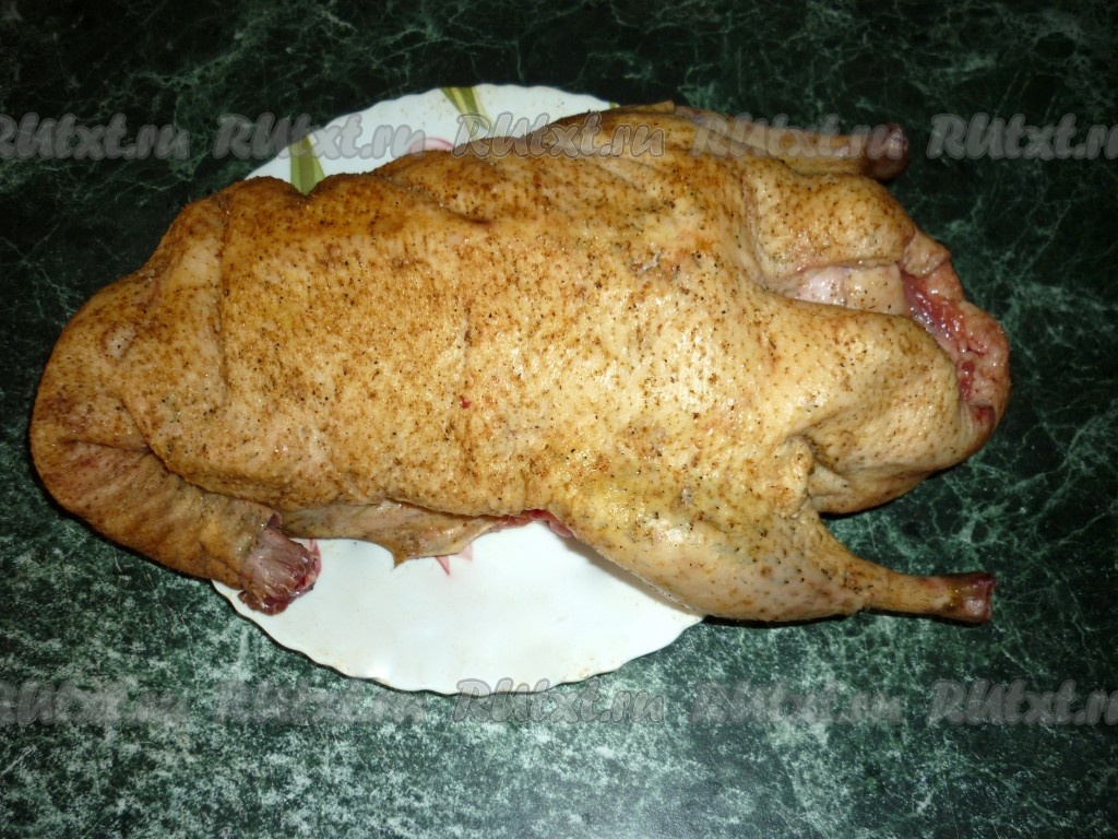 Утку тщательно вымыть, обсушить. Натереть утку внутри и снаружи солью и чёрным молотым перцем.