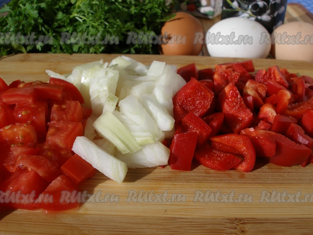 Очистить лук, удалить из болгарского перца семена. Нарезать лук, перец и помидоры на небольшие кусочки.
