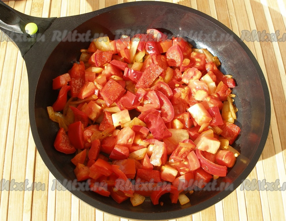 Лук выложить в сковороду с растительным маслом и обжарить его, помешивая, до золотистого цвета на среднем огне. Затем добавить нарезанные перец и помидоры, соль и специи по вкусу. Добавляя соль, учитывайте, что в дальнейшем будет добавляться достаточно солёная брынза.
