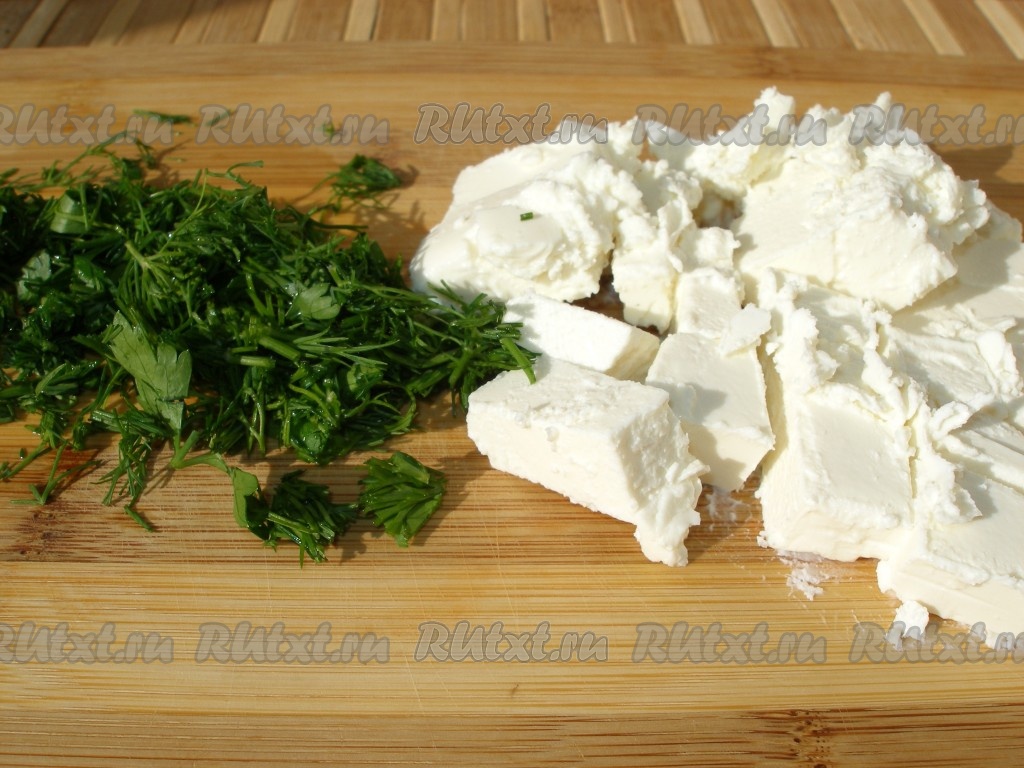 Зелень нарезать мелко, а брынзу - на крупные кубики.