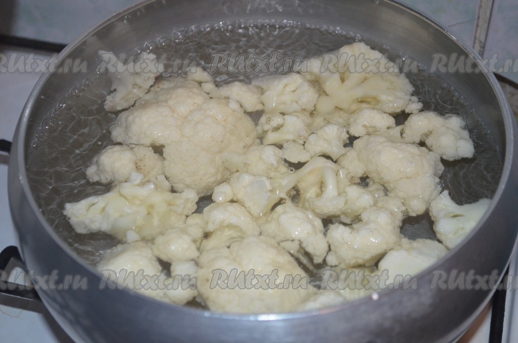Цветную капусту отварить в соленой воде 5 минут.