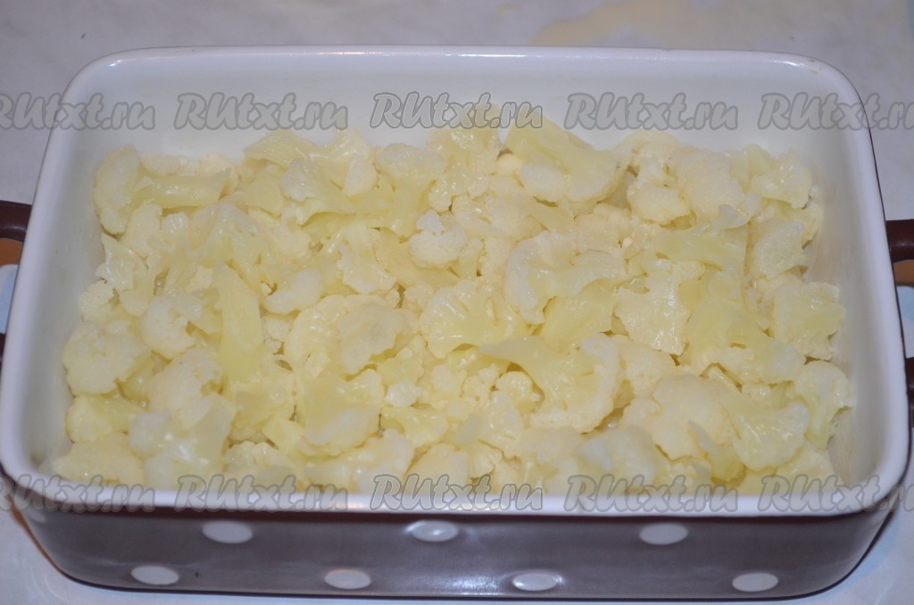 Разобрать цветную капусту на соцветия, положить в смазанную растительным маслом форму.