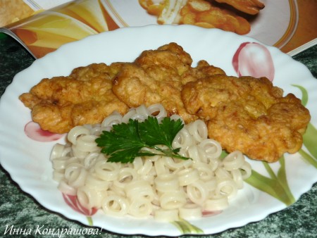 Периодически перемешивая рубленный фарш, постепенно жарим все котлеты из куриного филе. Благодаря майонезу и крахмалу, котлеты по-албански получаются нежными, сочными, аппетитными. Эти вкусные котлетки можно подать практически с любым гарниром (я подала с макаронами).