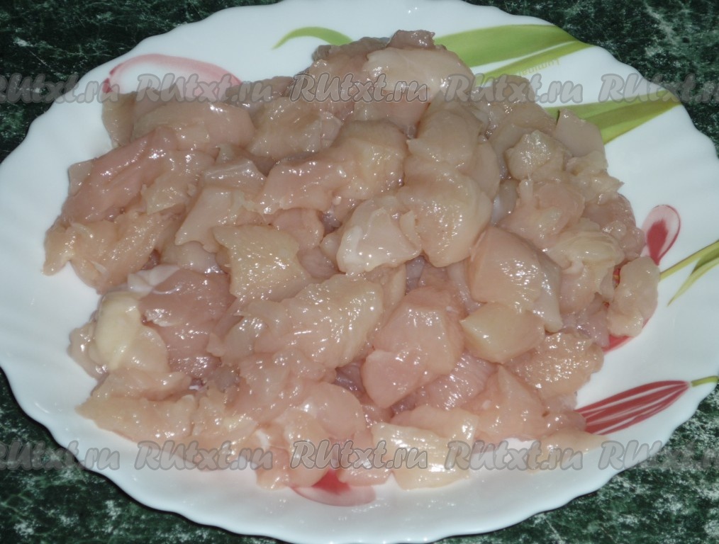 Нарезаем куриное мясо на мелкие кубики.