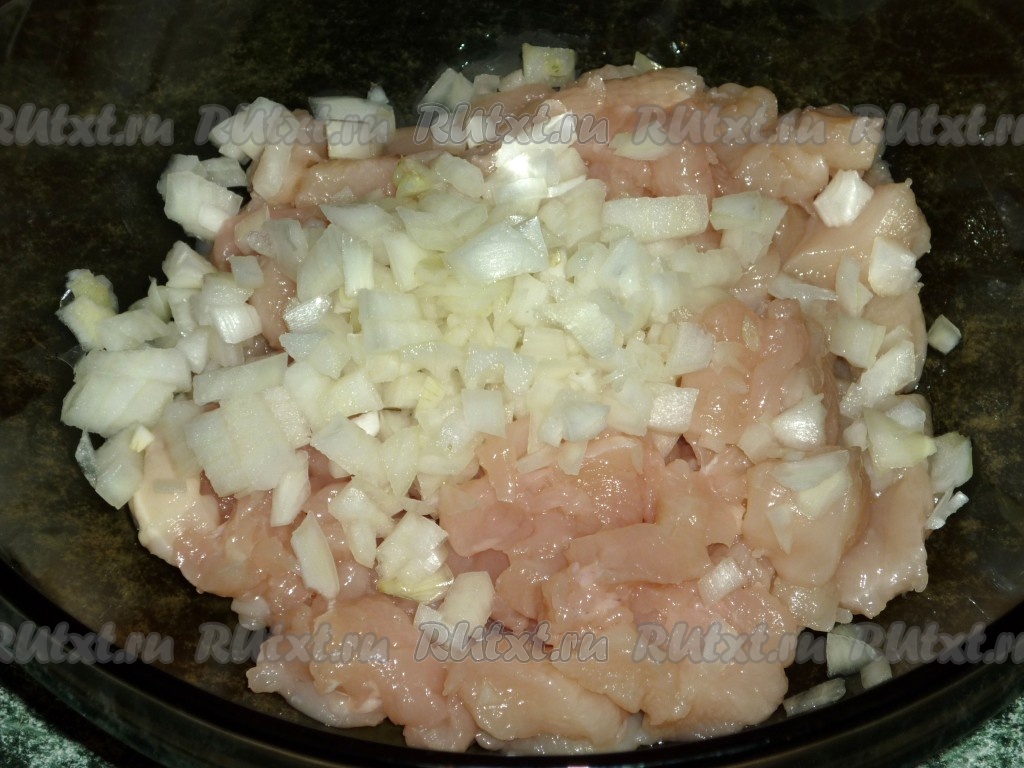 Лук очищаем и нарезаем мелко. Соединяем в миске нарезанные куриное филе и лук.