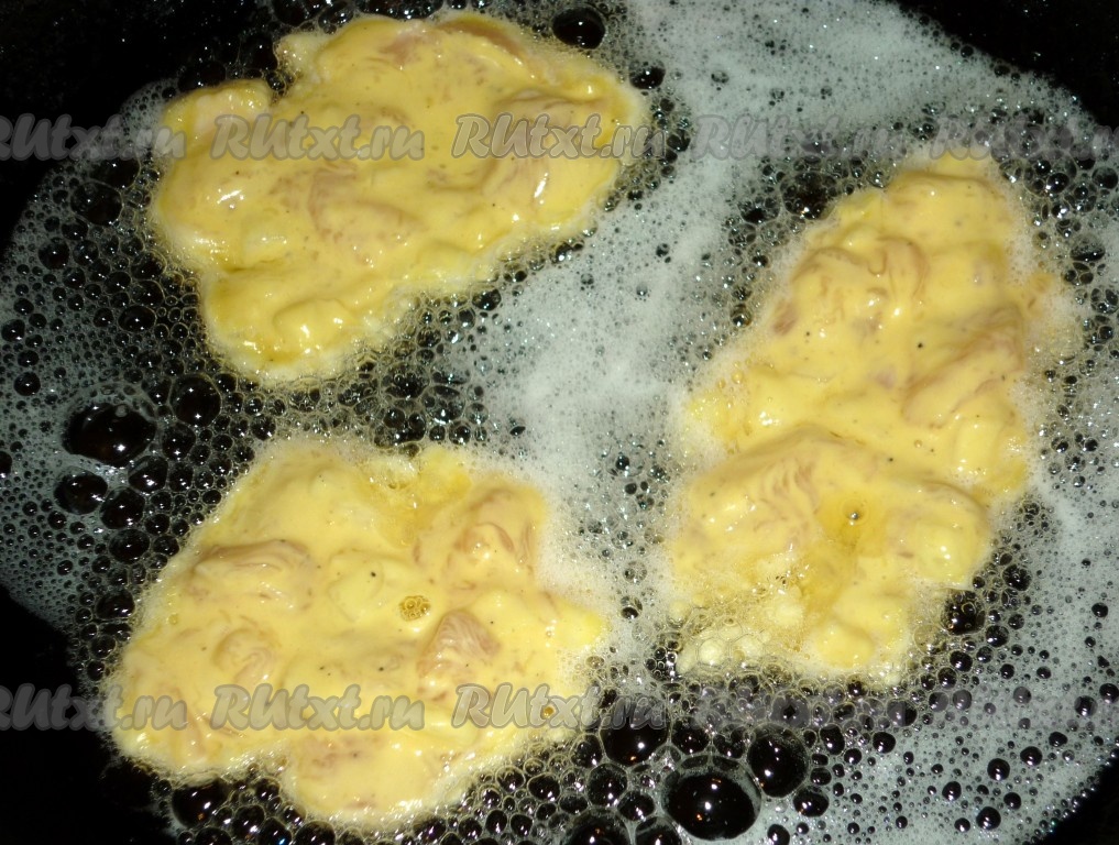 В сковороде разогреваем растительное масло, выкладываем 1 столовую ложку с верхом рубленного фарша, формируя достаточно плоские куриные котлеты, жарим их на среднем огне до румяности с двух сторон (примерно по 3-4 минуты с каждой стороны).