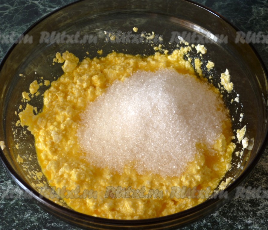 В объёмной миске соединить творог, яйца, сахар, соль и тщательно перемешать.