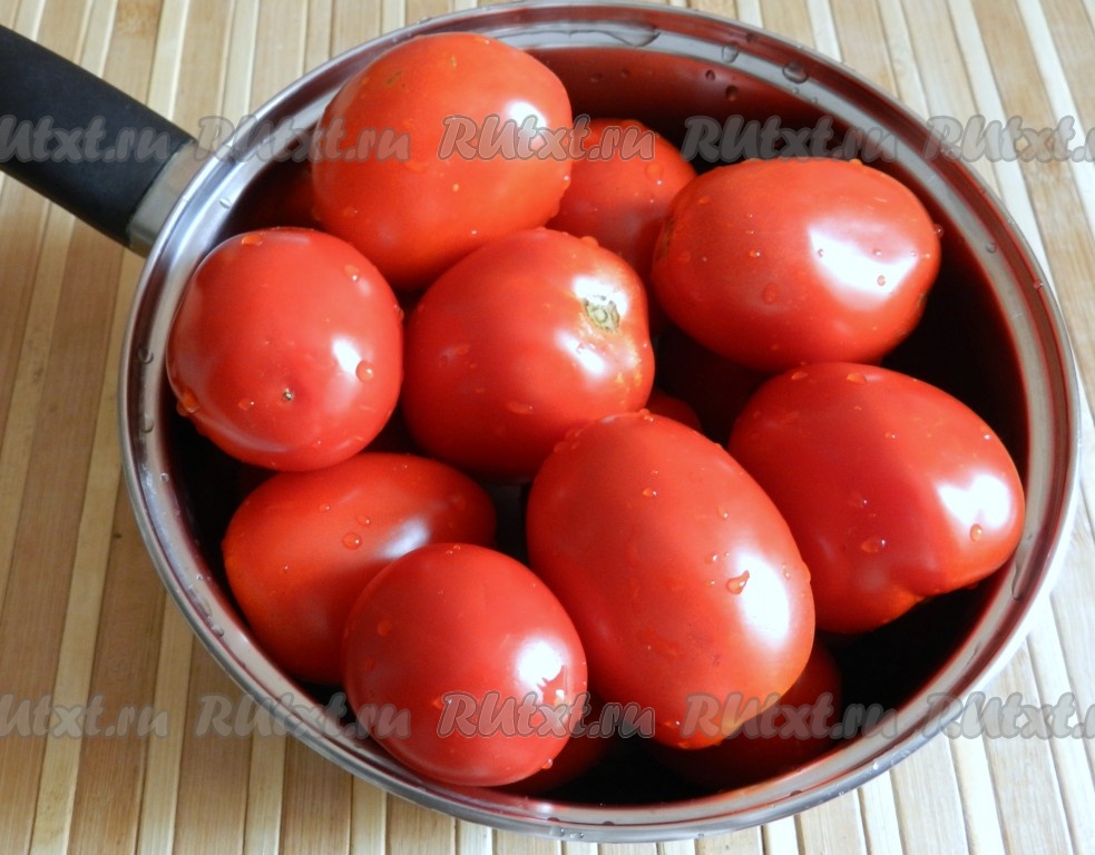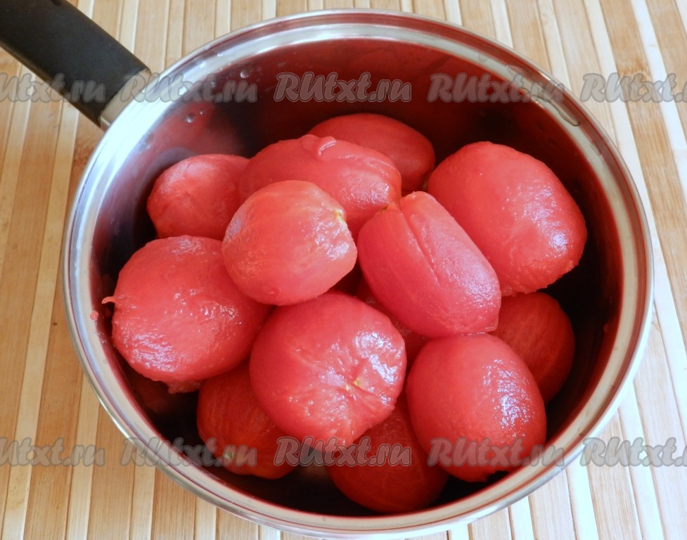 Помидоры вымыть. Сделать на них крестообразные надрезы и залить кипятком на 10 минут. Затем опустить помидоры в холодную воду.