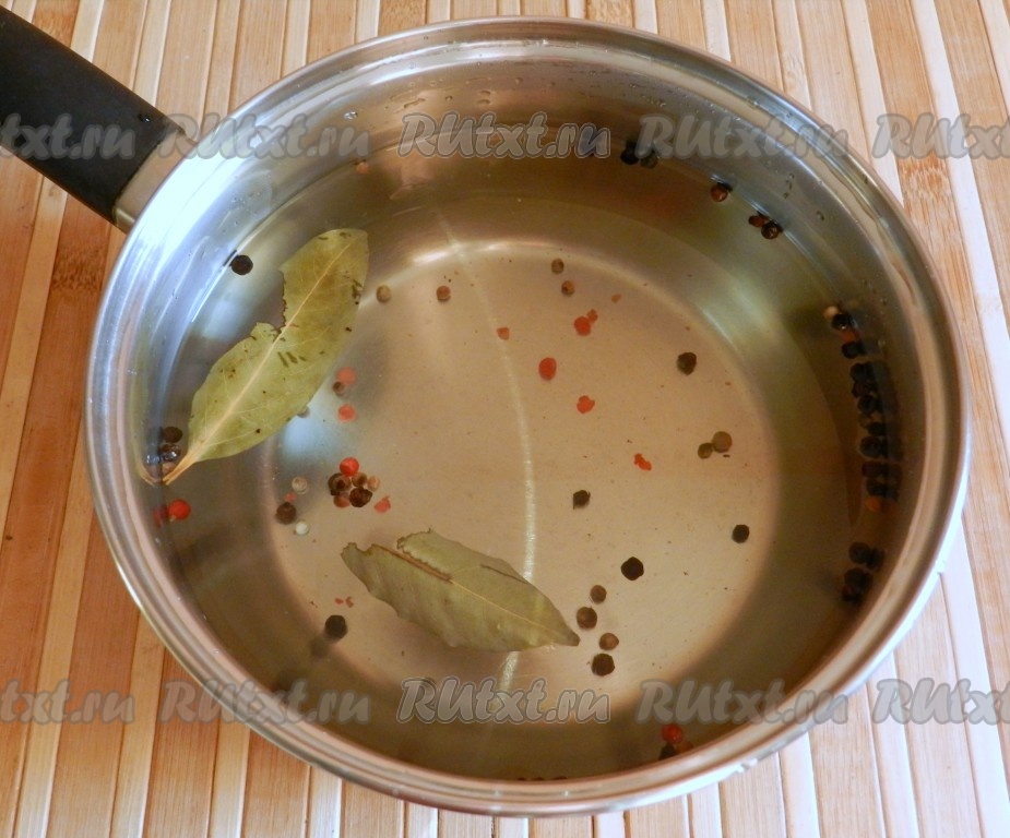 Для маринада смешать воду, уксус, специи, соль и сахар. Довести до кипения, убрать с огня и остудить.