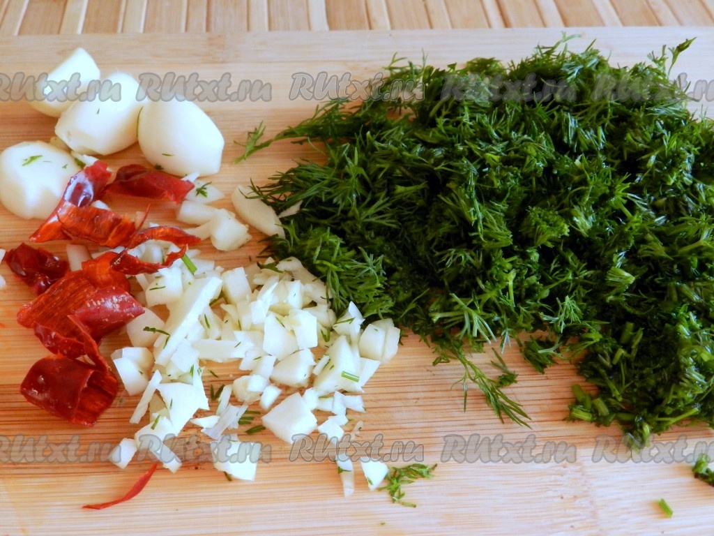 Мелко нарезать укроп, чеснок. Перец очистить от семян и нарезать полукольцами.