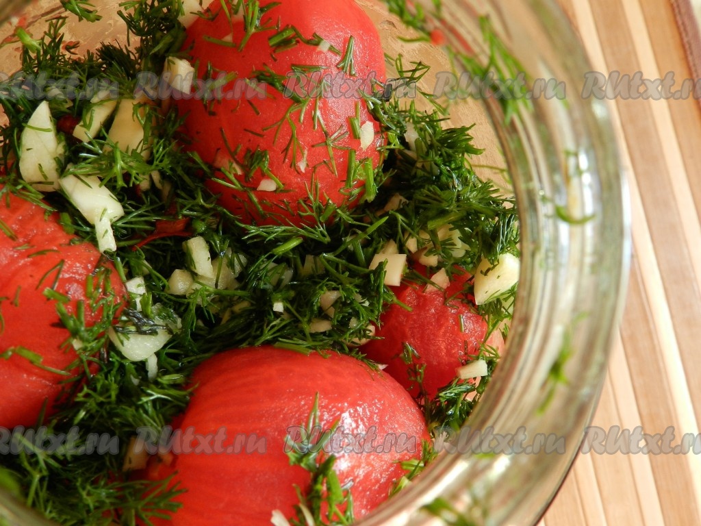 Очищенные от кожуры помидоры, складывать в банку, пересыпая нарезанной зеленью, чесноком и красным перцем. Залить теплым рассолом и оставить мариноваться на одни сутки.