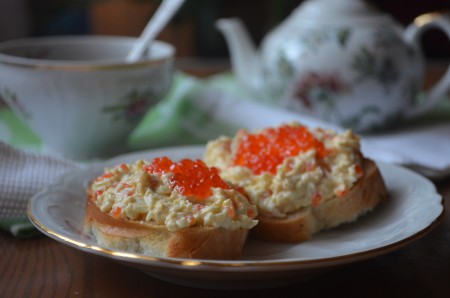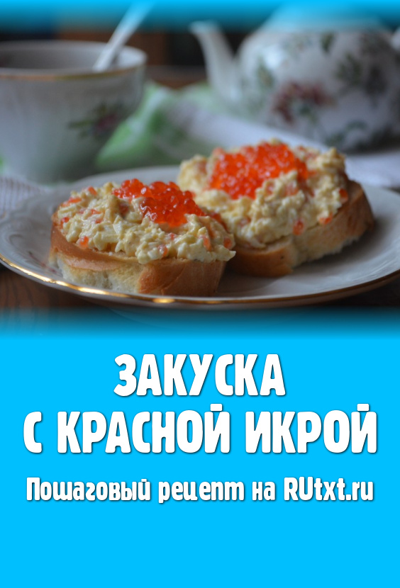 Я выложила закуску на кусочки белого хлеба, украсив бутерброды красной икрой. Отказаться от такого лакомства очень сложно. Вы получите не только вкусовое, но и эстетическое удовольствие.