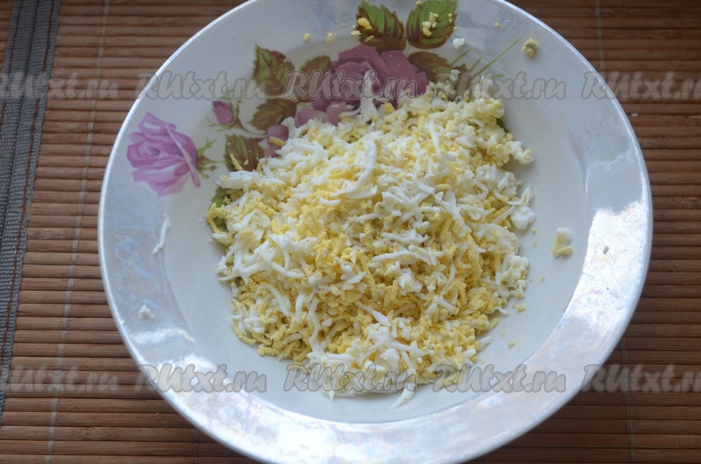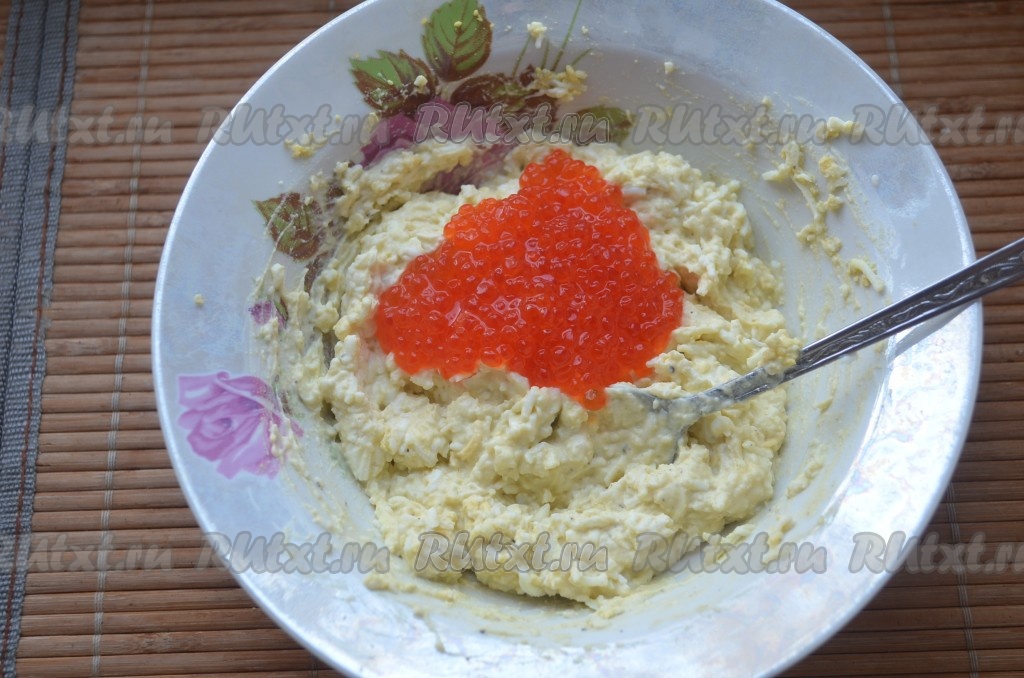 Соединить все ингредиенты закуски, добавить красную икру, аккуратно перемешать.