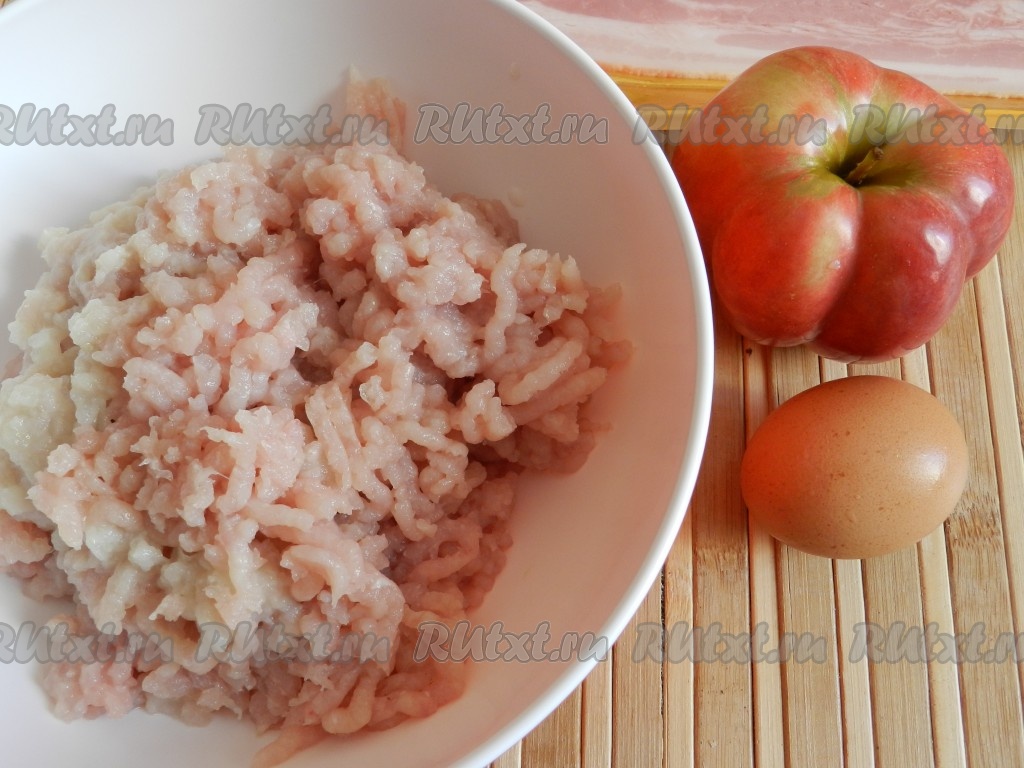 Добавить в куриный фарш яйцо, посолить (учитывая солёность бекона, в который в дальнейшем будут заворачиваться котлеты), поперчить и перемешать фарш до однородности. Из готового куриного фарша сформировать котлеты и каждую котлетку обернуть одной или двумя полосками бекона.