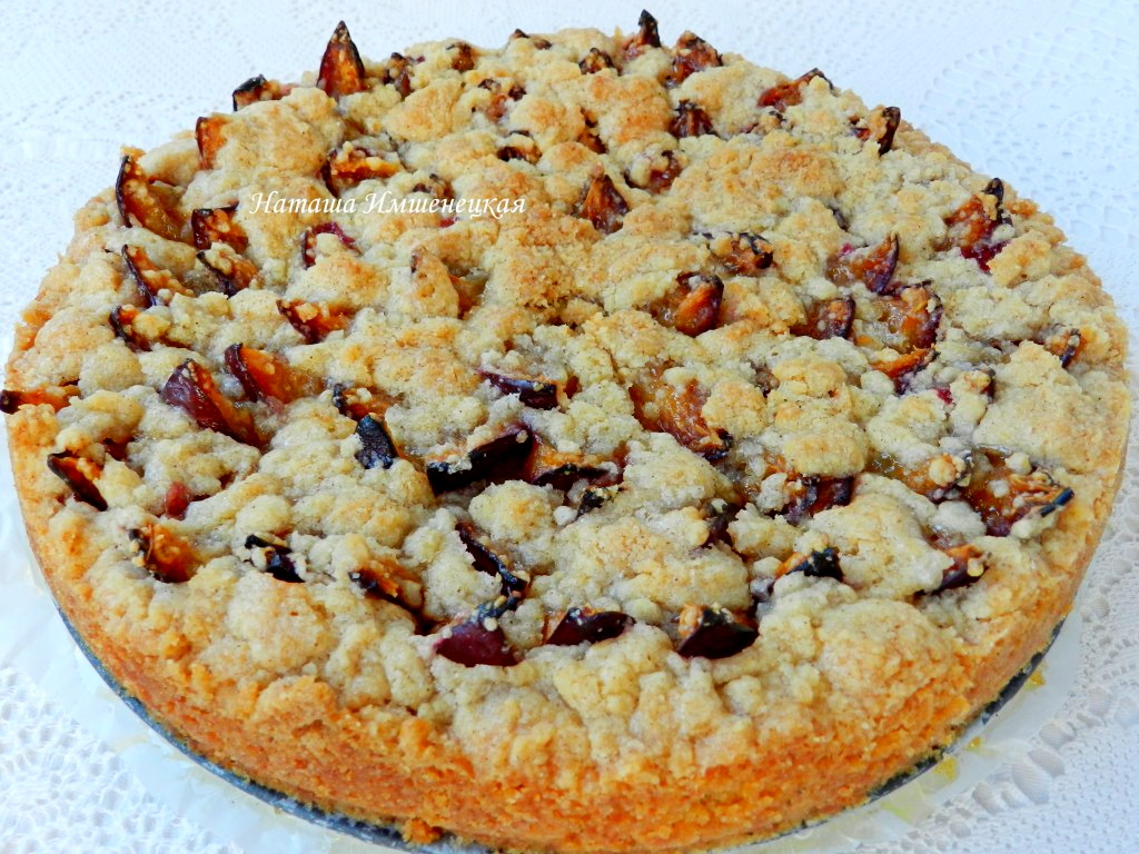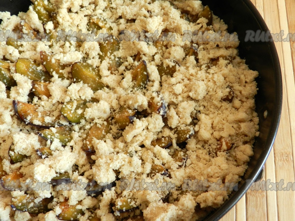 Поверх слив равномерно разложить оставшееся тесто-крошку. Выпекать песочный пирог со сливами в духовке, разогретой до 180 градусов, минут 45-50 (до подрумянивания теста).