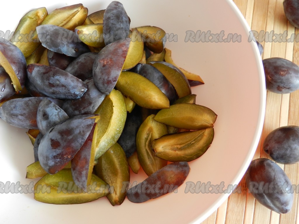 Сливы вымыть, очистить от косточек, нарезать на 4 части, выложить в миску.