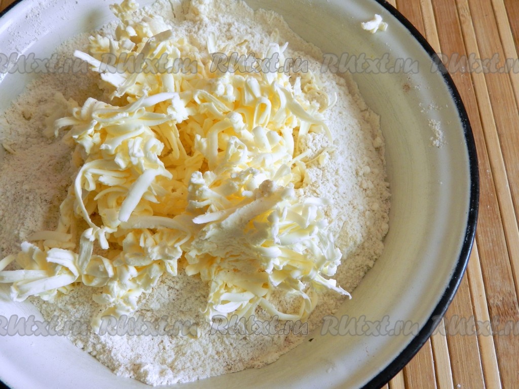 Сливочное масло достать из холодильника натереть на крупной тёрке, добавить в миску с сухими ингредиентами, получившуюся смесь растереть руками до получения крошки.